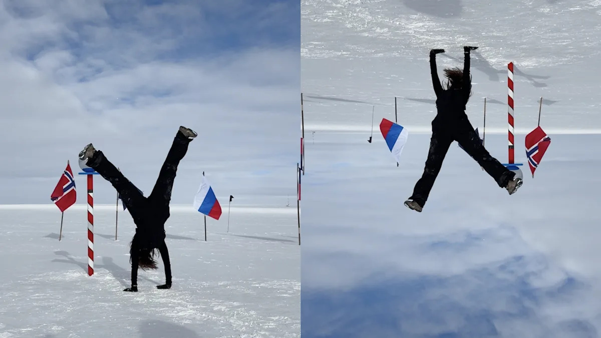 هذا هو الطريق الصحيح لأعلى: يقوم أبيجيل بيشوب بعمل اليدين في القطب الجنوبي الاحتفالي. أبيجيل أسقف