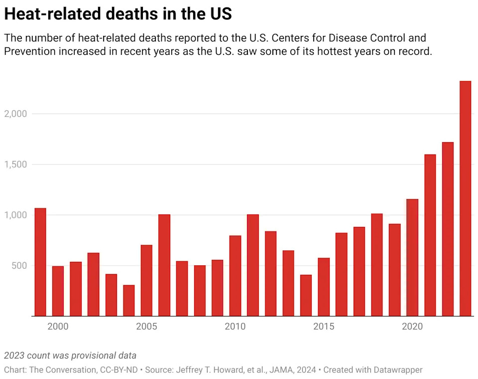 وقد ارتفعت الوفيات الناجمة عن الحرارة على مستوى العالم، بنسبة 23% منذ التسعينيات وحتى العقد الأول من القرن الحادي والعشرين، عندما شهد العام المتوسط أكثر من نصف مليون حالة وفاة مرتبطة بالحرارة. وحتى في الولايات المتحدة، تسببت القبة الحرارية في شمال غرب المحيط الهادئ في عام 2021 في مقتل مئات الأشخاص.