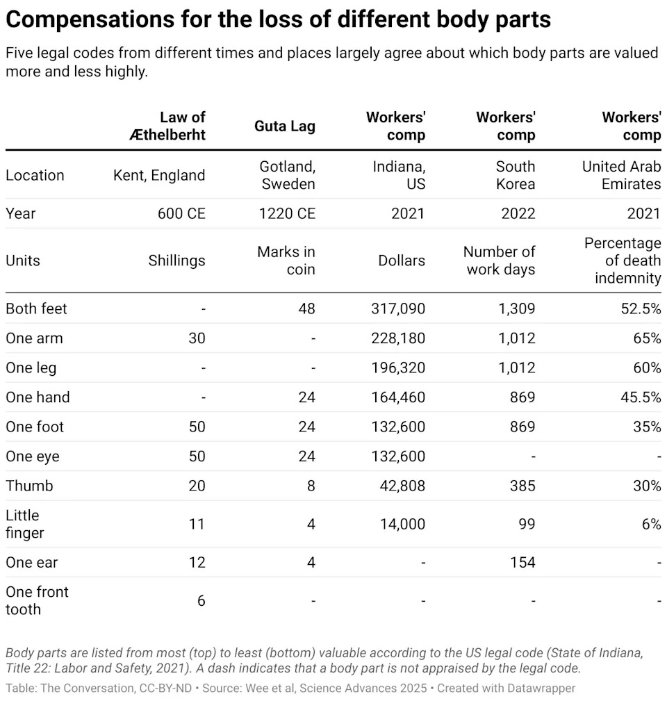 استكشفت دراستنا الجديدة احتمالًا مختلفًا، وهو أن القوانين المتعلقة بالضرر الجسدي متجذرة في شيء عالمي يتعلق بالطبيعة البشرية: الحدس المشترك حول قيمة أجزاء الجسم.