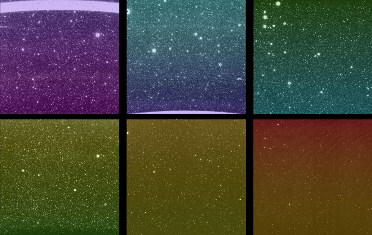 أحد التعرضات الأولى التي استولت عليها ناسا. استحوذت كل من كاشفات المرصد الستة على واحدة من هذه الصور غير المعايرة ، والتي تمت إضافة ألوان الضوء المرئية لتمثيل الأطوال الموجية بالأشعة تحت الحمراء. يمتد مجال العرض الكامل لـ Spherex إلى أفضل ثلاث صور ؛ يتم التقاط نفس مساحة السماء أيضًا في الصور الثلاث السفلية. / الائتمان: NASA/ JPL-Caltech