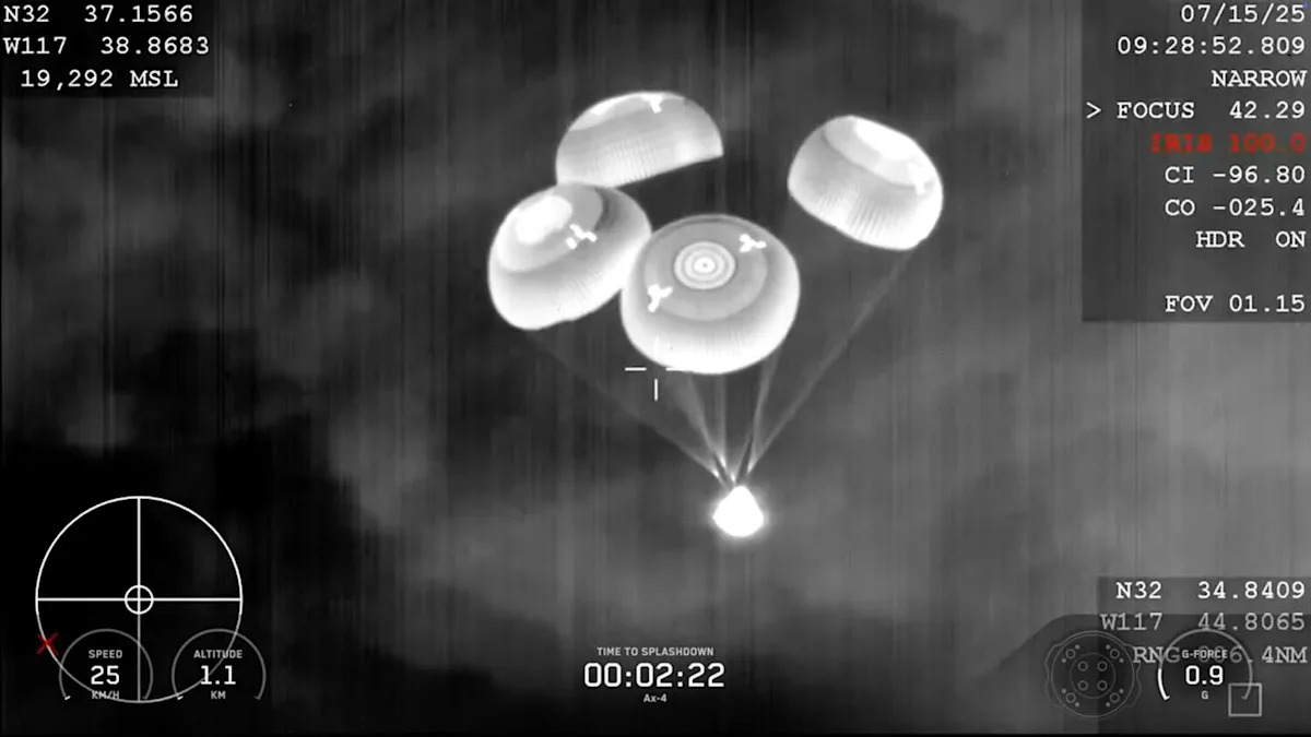 رائد فضاء ناسا المتقاعد Peggy Whitson ، حامل سجل الولايات المتحدة للوقت في المكان، طيار الاختبار الهندي Shubhanshu Shukla ، رائد الفضاء البولندي Sławosz Uznański-Wiśniewski والمهندس المجري Tibor Kapu من محطة الفضاء في وقت مبكر من الاثنين.