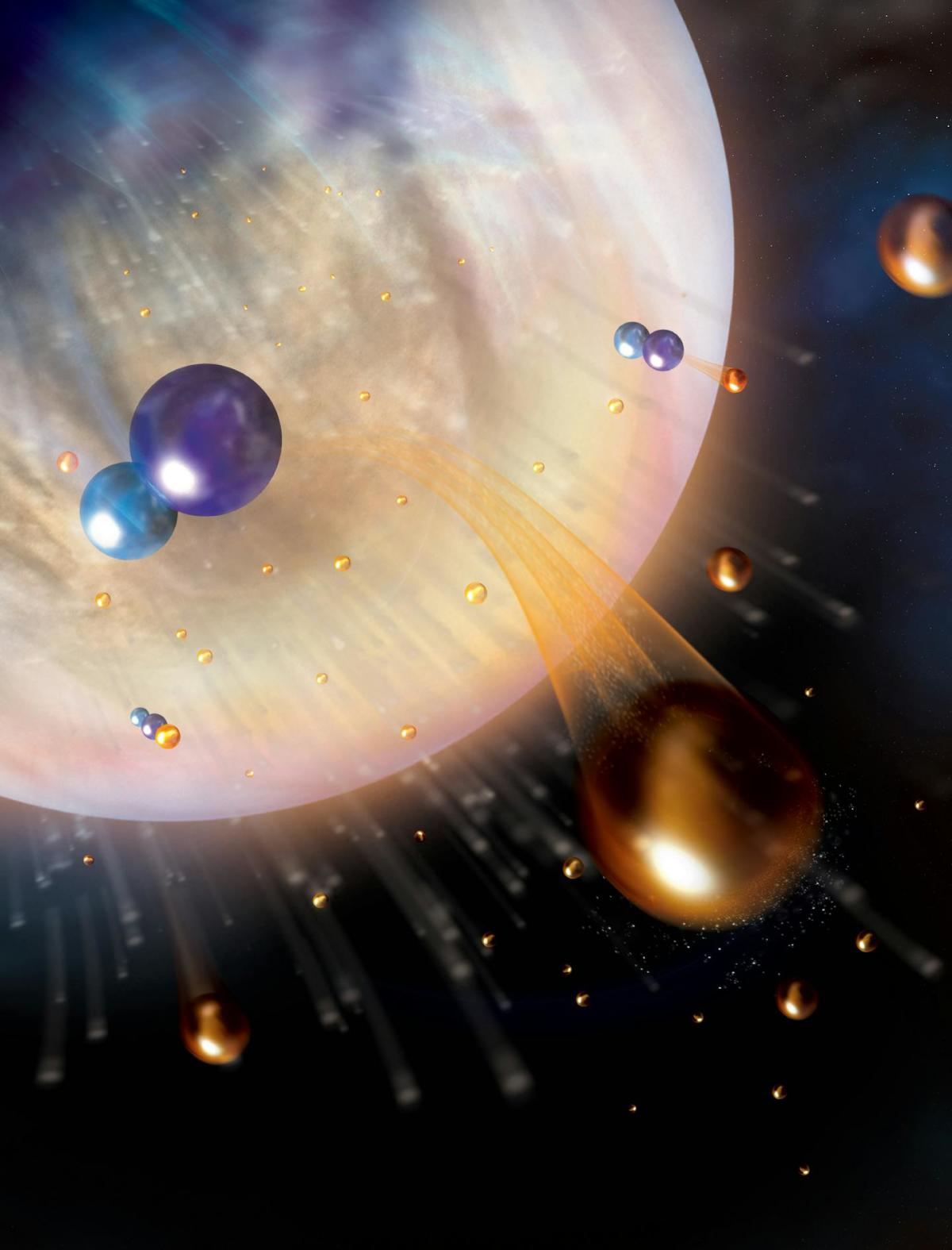 وإليك كيف يعمل. في الغلاف الجوي، تتحد جزيئات HCO⁺ الغازية، والتي تتكون من ذرة واحدة من كل من الهيدروجين والكربون والأكسجين ولها شحنة موجبة، مع الإلكترونات سالبة الشحنة، حيث تتجاذب الأضداد.