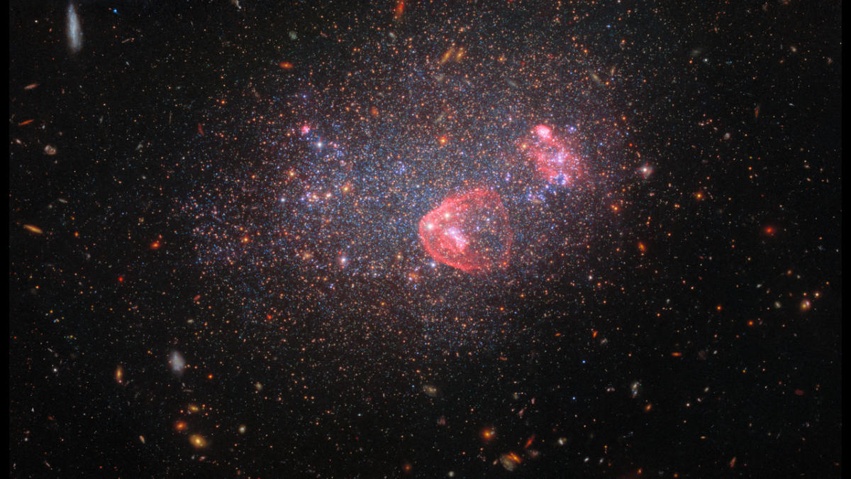 موضوع الصورة هو UGC 8091 الذي يحتوي على مليار نجم، وهو قزم غير منتظم galaxy تقع داخل كوكبة العذراء، حوالي 7 مليون سنة ضوئية من أرض. ولإنشاء التأثير اللوني المضيء الذي نراه، قام العلماء بتجميع البيانات التي تم التقاطها بواسطة تلسكوب هابل الفضائي الكاميرا واسعة المجال 3 والكاميرا المتقدمة للاستطلاعات بين عامي 2006 و2021.