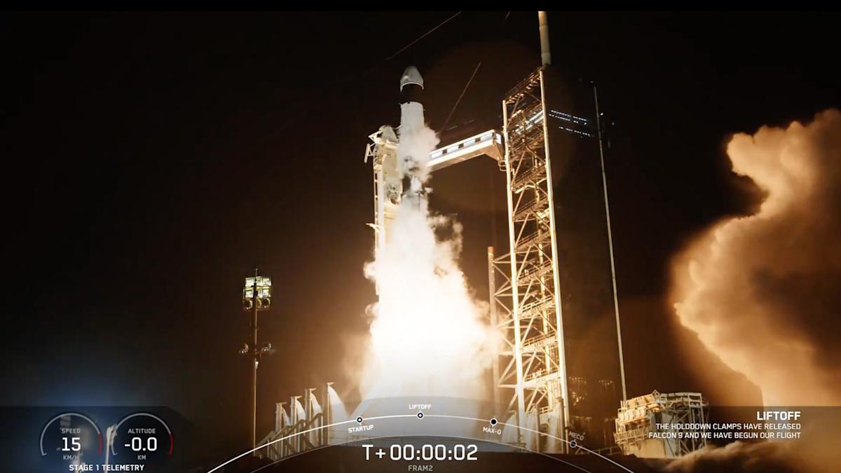 رفعت مهمة Fram2 الخاصة على قمة صاروخ Falcon 9 من Complex-39a في مركز كينيدي للفضاء في ناسا في فلوريدا اليوم (31 مارس) في الساعة 9:46 مساءً بتوقيت شرق الولايات المتحدة (0146 بتوقيت جرينتش في 1 أبريل) ، مما أرسل كبسولة تنين الطاقم “المرونة” في مدار قطبي مع Quartet من مسافة الفضاء.