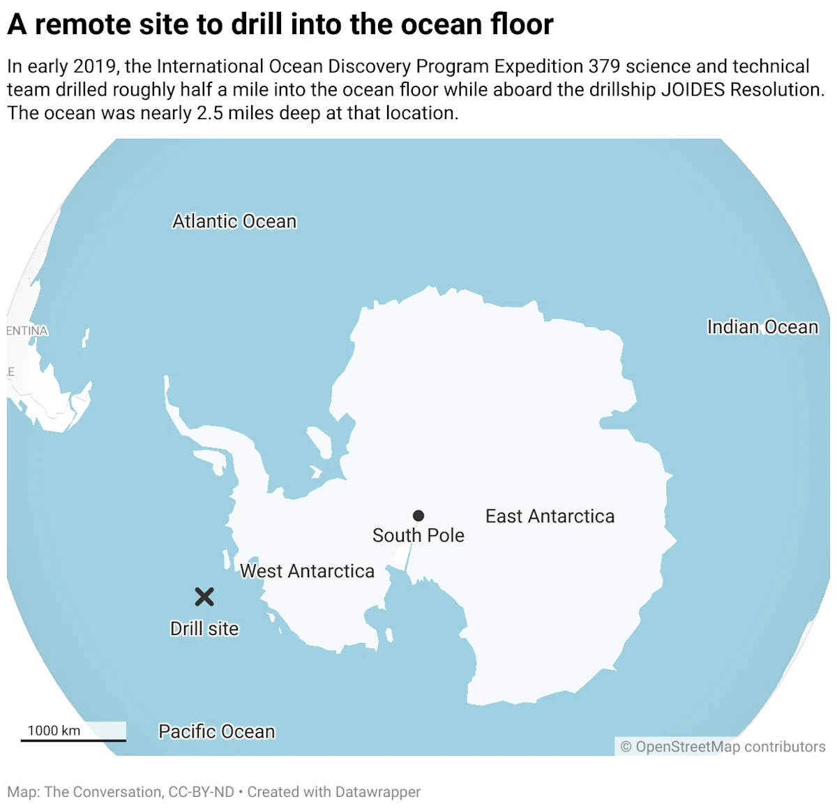على متن سفينة الحفر JOIDES Resolution، أنزل العمال عملية حفر لمسافة 13000 قدم (3962 مترًا) تقريبًا إلى قاع البحر ثم حفروا 2605 قدمًا (794 مترًا) في قاع المحيط، بعيدًا عن الشاطئ مباشرة من الجزء الأكثر عرضة للخطر من الغطاء الجليدي في غرب القطب الجنوبي.