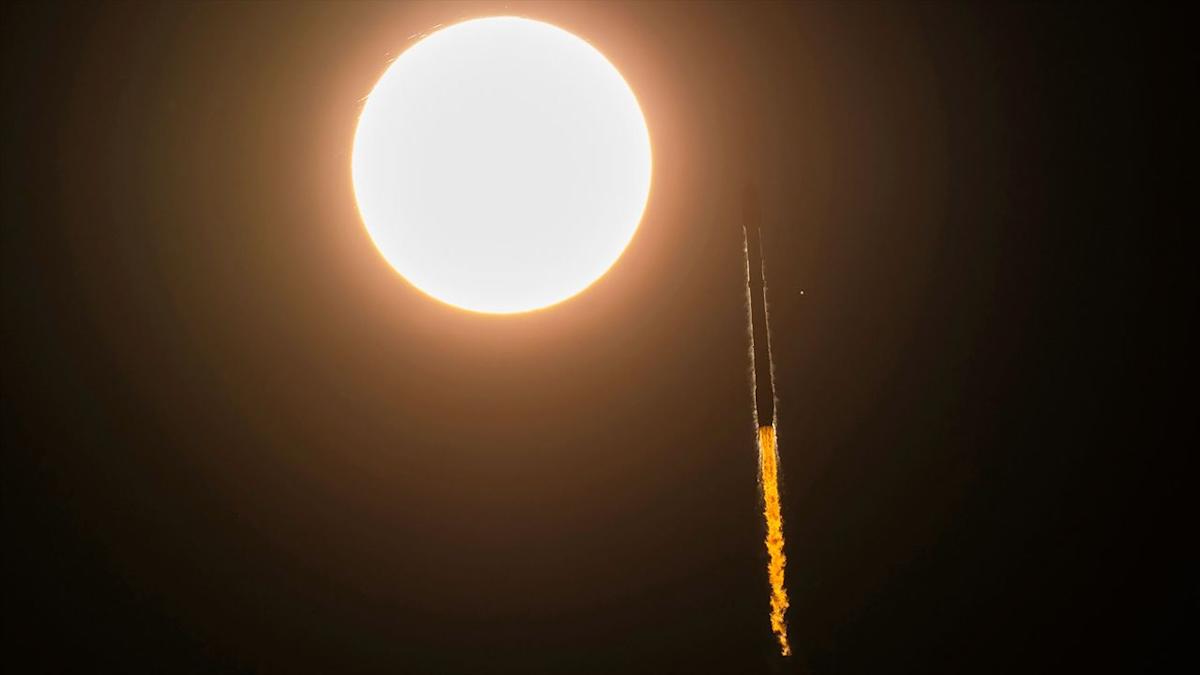 يتم تصوير صاروخ Spacex Falcon 9 الذي يحمل 28 STARLINK في مدار منخفض الأرض حيث يبدو أنه يطير بجوار الشمس من محطة Cape Canaveral Force Force في فلوريدا يوم الأحد 31 أغسطس 2025. | الائتمان: SpaceX