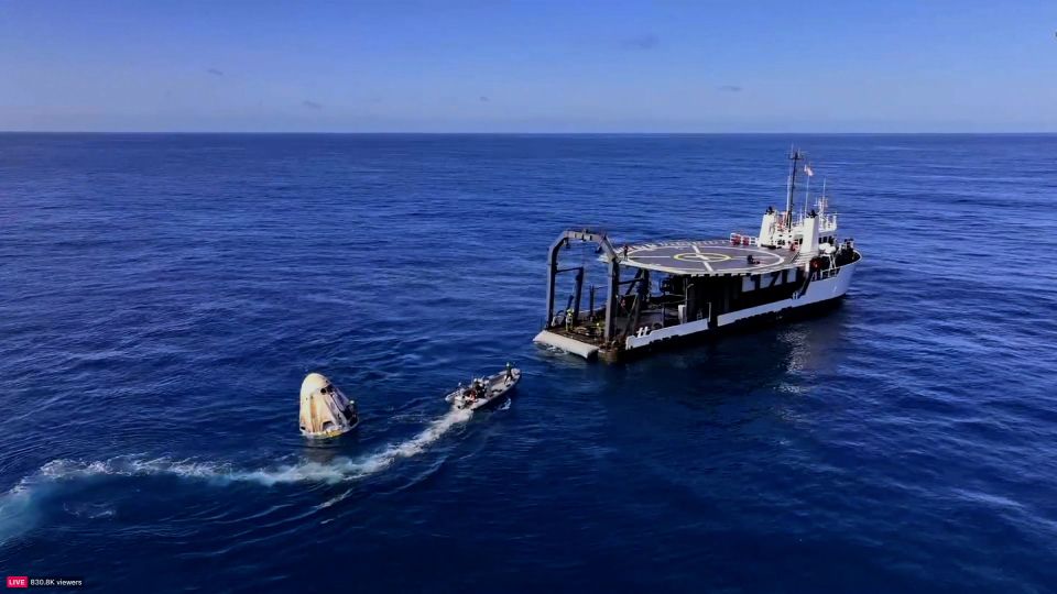 يصل طاقم الاسترداد إلى كبسولة Fram2 Mission Dragon قبالة ساحل كاليفورنيا يوم الجمعة في لقطة الشاشة هذه من الفيديو. – من SpaceX