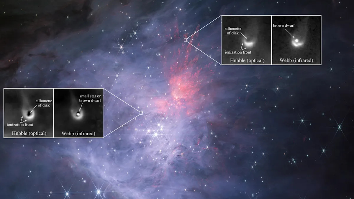 نظرة على سديم أوريون باستخدام كل من التلسكوبات الفضائية Hubble و James Webb. | الائتمان: NASA/ESA/CSA ، Mark McCaughrean/ESA ، Massimo Robberto/STSCI/JHU ، Kevin Luhman/Penn State ، Catarina Alves de Oliveira/ESA.