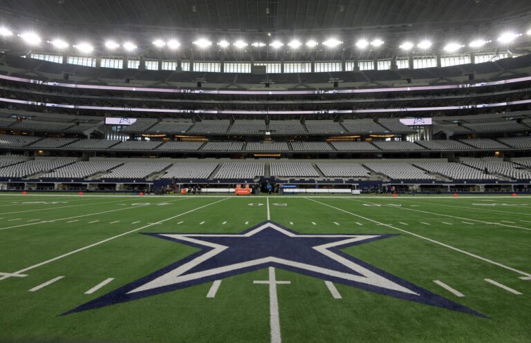 30 نوفمبر 2017؛ أرلينغتون، تكساس، الولايات المتحدة الأمريكية؛ منظر عام لملعب AT&T مع شعار Dallas Cowboys على لوحة الفيديو أثناء مباراة كرة القدم NFL بين فريق Washington Redskins وCowboys في ملعب AT&T. الائتمان الإلزامي: كيربي لي-USA TODAY Sports