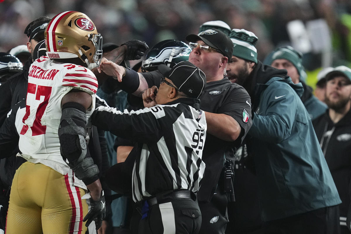 تصاعدت الأمور بين Greenlaw وDiSandro خلال فوز 49ers يوم الأحد بعد تدخل Greenlaw القوي لمستقبل Eagles DeVonta Smith على طول الخط الجانبي لـ Eagles. أدت الضربة بعد صافرة الحكم إلى رفع علم سلوك غير رياضي على جرينلو.