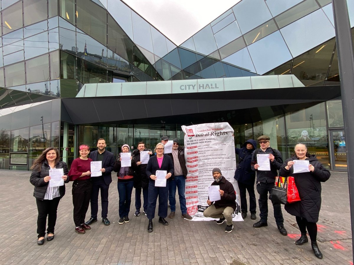 في نوفمبر الماضي ، شارك مئات الأشخاص في مسيرة احتجاج إلى مقر TFL في Palestra لزيادة مخاوف بشأن ظروف العمل التي تحملها سائقو الحافلات.