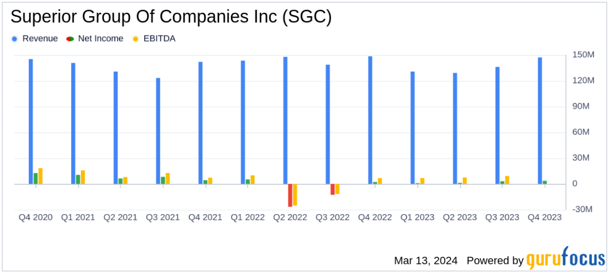 في 13 مارس 2024، أصدرت مجموعة شركات Superior Group Of Companies Inc (NASDAQ:SGC) ملف 8-K، الذي يتضمن تفاصيل النتائج المالية للربع الرابع من عام 2023. الشركة، المعروفة بتصميم منتجات الملابس والمتخصصة في المنتجات ذات العلامات التجارية وملابس الرعاية الصحية ومراكز الاتصال، عن انخفاض طفيف في صافي المبيعات ولكن زيادة ملحوظة في صافي الدخل والأرباح قبل الفوائد والضرائب والإهلاك والاستهلاك مقارنة بالربع نفسه من العام السابق.