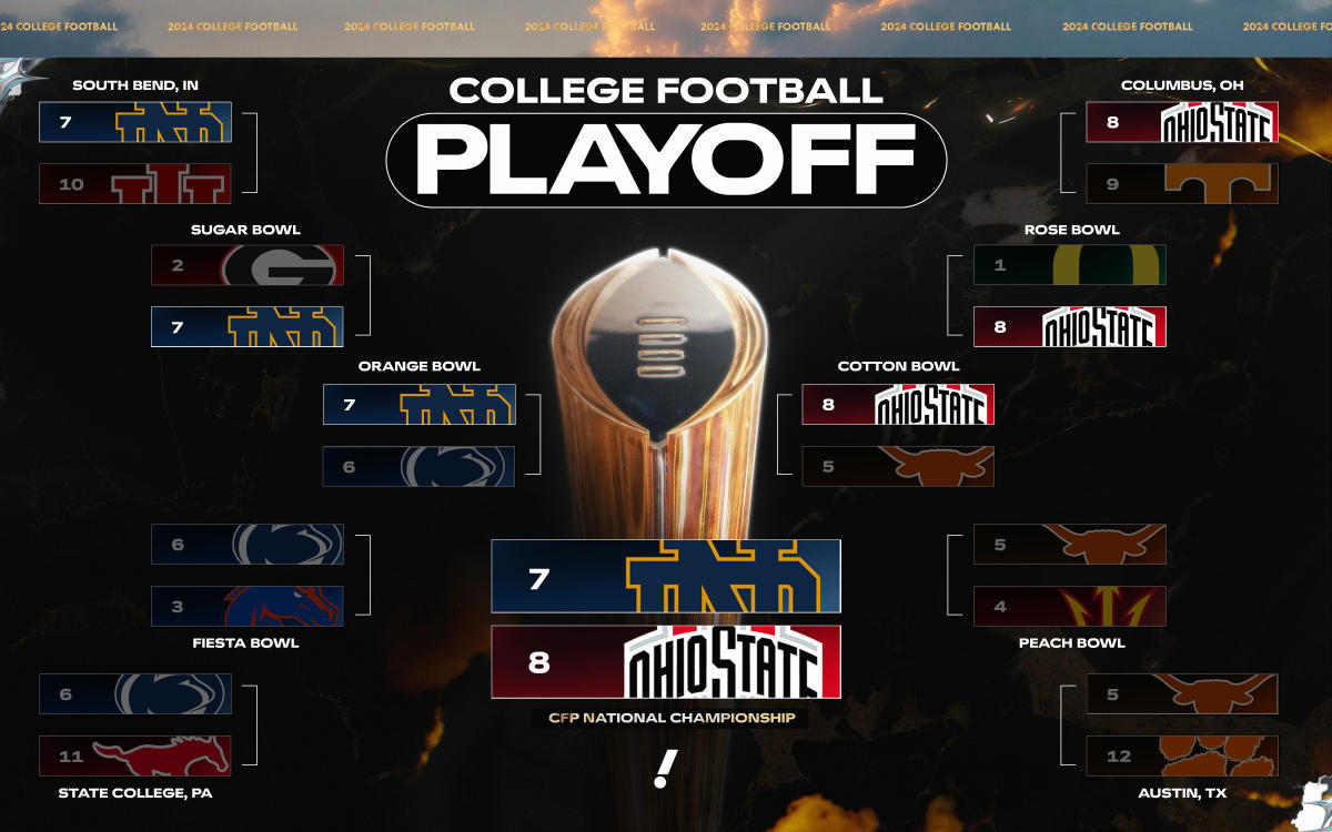 يعد CFP بمثابة مكافأة رائعة لمتعة كرة القدم، مباراة تلو الأخرى من مباريات كرة القدم المثيرة (في بعض الأحيان) والتي تتراوح من غير المتوقع إلى الرائع. تكمن المشكلة في أن برنامج CFP الموسع يتطلب الآن ألعابًا مدتها أربعة أسابيع، وليس أسبوعين، كما أن وضع هذه الألعاب في أكثر الأماكن ازدحامًا خلال العام ليس بالمهمة السهلة.