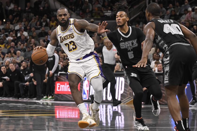 بعد ثلاثية ثلاثية في انتصارات ليكرز على فيلادلفيا وتورنتو وممفيس، فعلها جيمس مرة أخرى يوم الجمعة في سان أنطونيو.