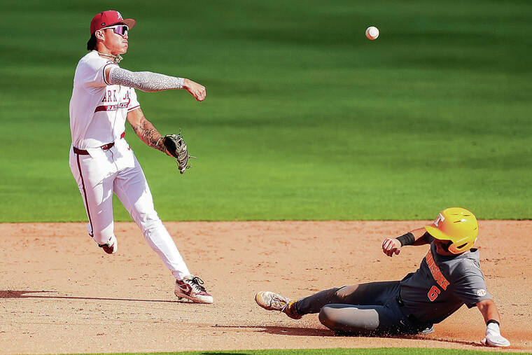 في لعبة أخرى شملت لاعبي هاواي ، تمسك أركنساس بهزيمة تينيسي 4-3 في المباراة الافتتاحية لـ Fayetteville (Ark.) Super Regional.