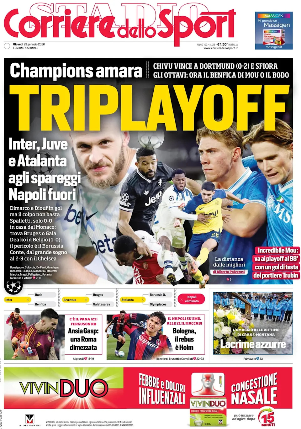 ديماركو وضيوف وضعوا أسمائهم في الهجوم الخاطف في دورتموند، لكن النيراتزوري ظلوا خارج مجموعة الثماني. الآن بنفيكا أو بودو. عودة تشيلسي على ملعب مارادونا، وإقصاء كونتي. سقوط أتالانتا في بلجيكا؛ أولمبياكوس أو بوروسيا في الملحق.