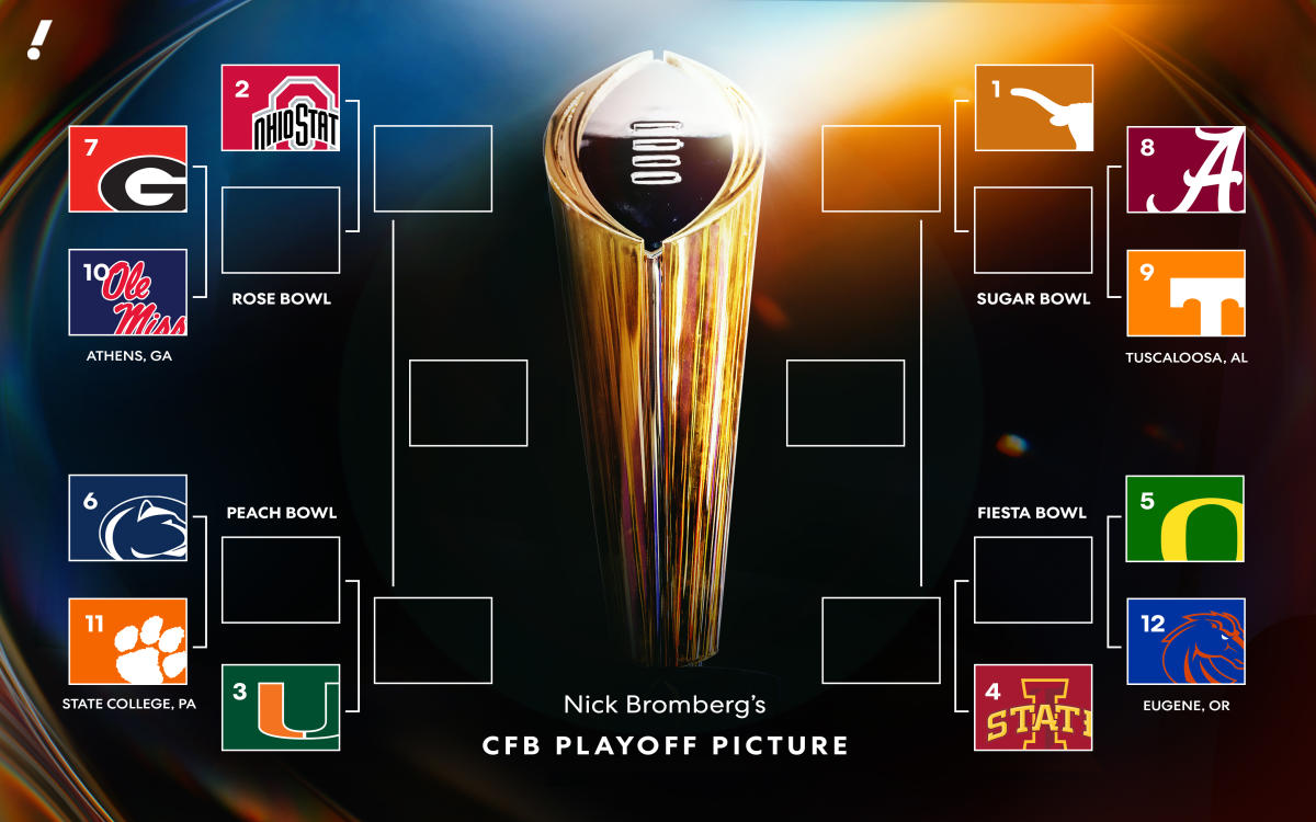 بدون تصنيفات CFP كدليل لنا، سنعتمد في الغالب على AP Top 25 كمقياس لدينا لعرض المجال. عادةً ما يكون لتصنيفات CFP واستطلاع AP أوجه تشابه أكثر من الاختلافات في نهاية الموسم. إليك ما يبدو عليه ملعب التصفيات المؤقت بعد عطلة نهاية أسبوع مليئة بالمفاجآت الهائلة.