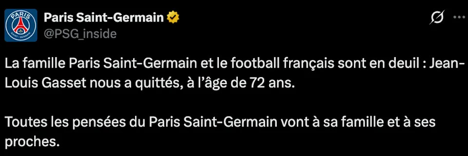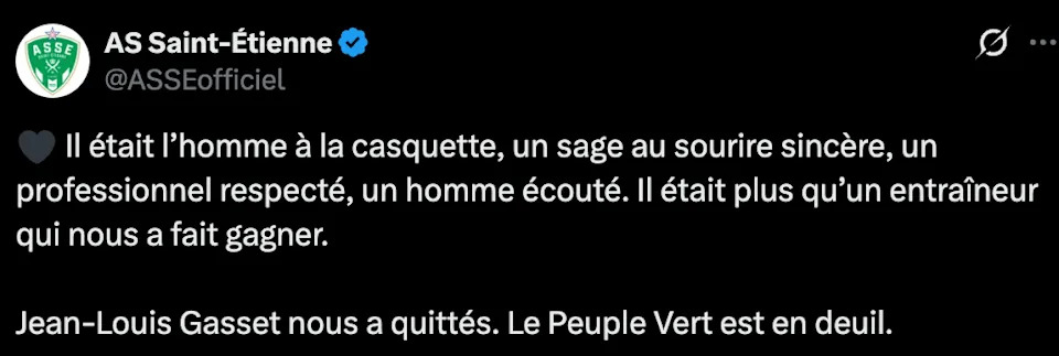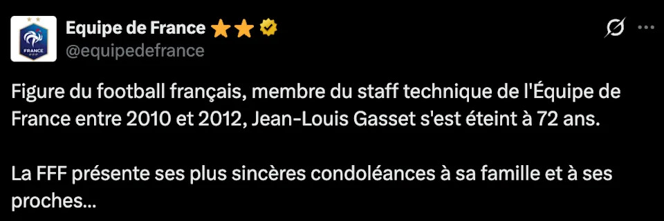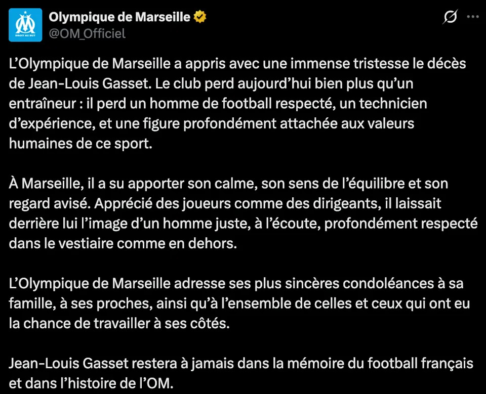 توفي جان لويس جاسيت يوم الجمعة، 26 ديسمبر، عن عمر يناهز 72 عامًا. كان لاعب خط وسط مونبلييه السابق شخصية بارزة في كرة القدم الفرنسية، وكان يتمتع بمسيرة طويلة كمدرب ومساعد، ولا سيما العمل مع باريس سان جيرمان، ونادي أولمبيك مارسيليا، وبوردو، وسانت إتيان، وحتى منتخب ساحل العاج.