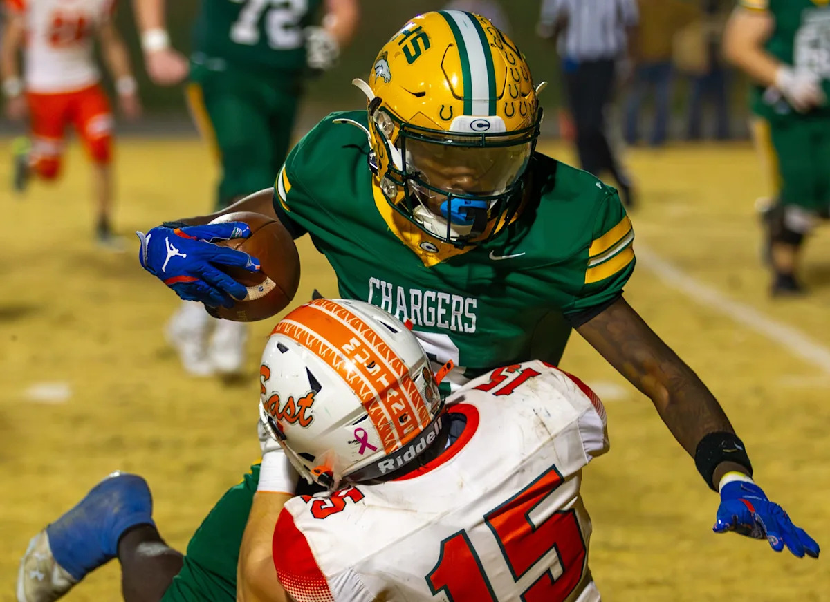يتطلع جيسون بلاك لاعب فريق كريست لكرة القدم إلى الإفلات من قبضة مهاجم إيست لينكولن خلال فوزه 31-14 في 21 نوفمبر 2025 في بويلينج سبرينغز.