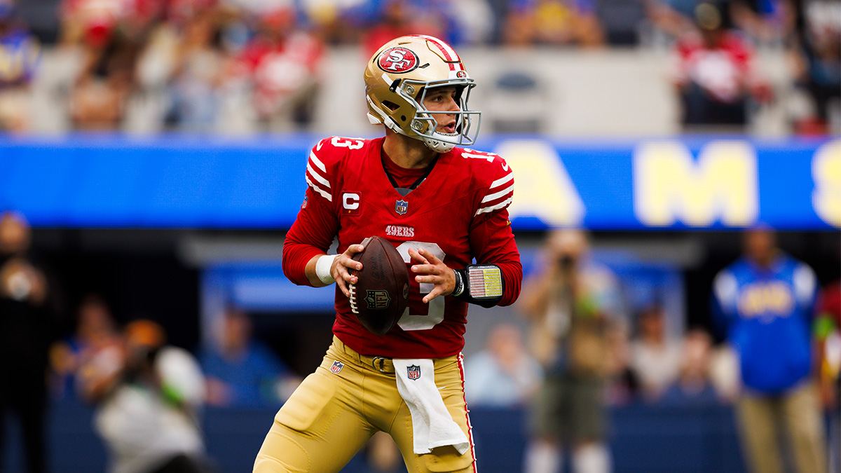 كيف تعادل لاعب الوسط في فريق 49ers Purdy مع عضو قاعة المشاهير Warner في كتاب سجلات NFL ضد Rams ظهر في الأصل على NBC Sports Bay Area