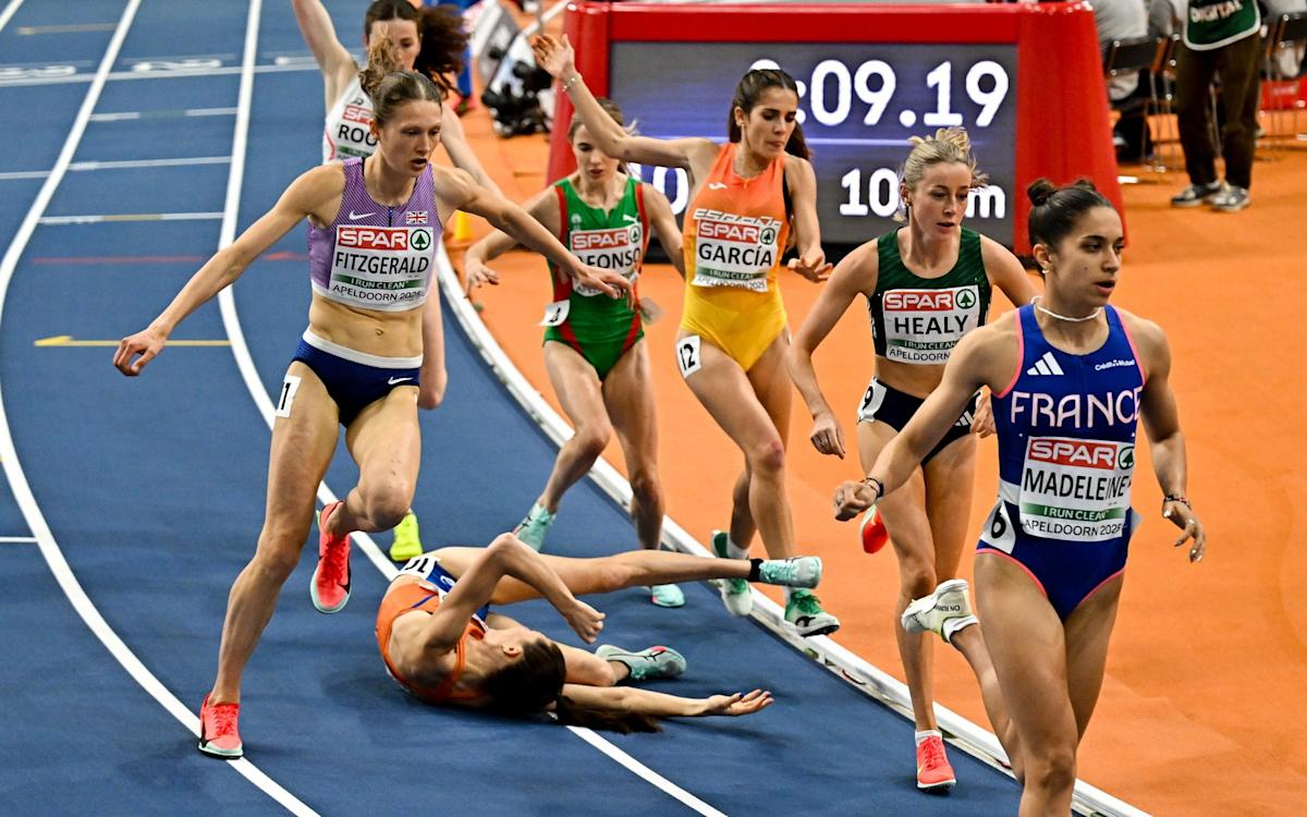 مع الانتهاء من المتسابقين لتوه أول كيلومتر من 3000 متر ، سقط الرياضي الهولندي مورين كوستر بعد تعثره في حفنة معبأة بين الثنائي البريطاني هانا نوتال وإينس فيتزجيرالد.