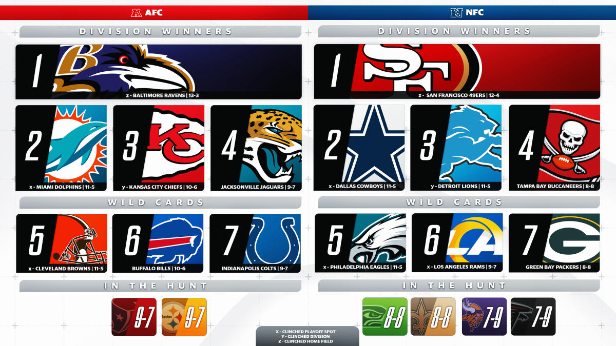 بطاقة الاتحاد الآسيوي الشاملة: ينضم فريق “ستيلرز” (9-7) إلى فريق “جاغوار” و”بيلز” و”كولتس” و”تكسانز” في المعركة من أجل الحصول على آخر مركزين للبطاقات الجامحة. لا يزال بإمكان الفرق الأربعة الأخيرة أيضًا الفوز بدوريتها.