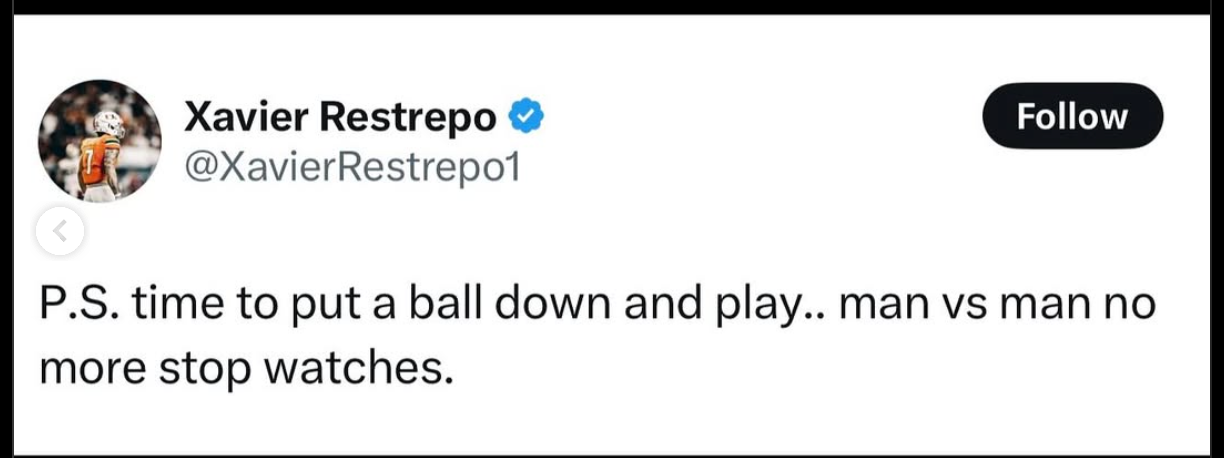 وبحسب ما ورد ركض Restrepo 4.83 ثانية 40 في يوم Miami's Pro في 5 أقدام و 20 جنيه. وأدى ذلك إلى الكثير من النقاش حول وسائل التواصل الاجتماعي ، حتى مع بعض النقاش حول ما إذا كان 40 مرة جعلت recrepo غير قابلة. ردت Restrepo ، المتلقي الجامعي المزين للأعاصير الذي كان من المتوقع أن يكون الهدف المفضل لدى Cam Ward في عام 2024 ، لمناقشة 40 مرة على X.