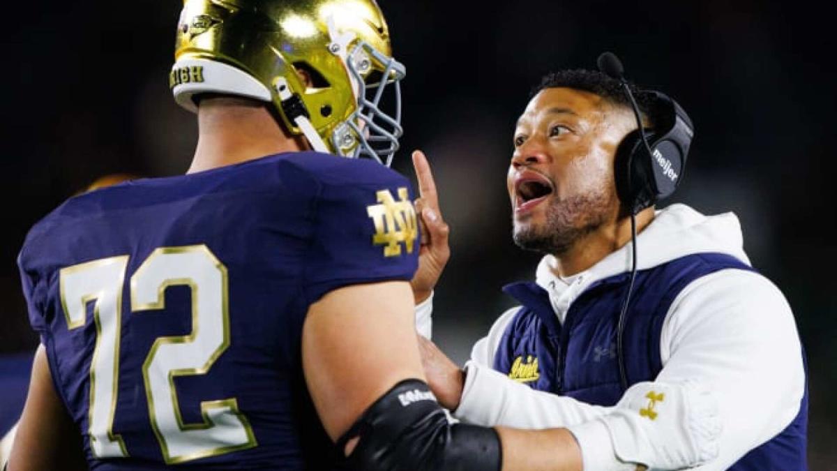 يقوم ماركوس فريمان، مدرب نوتردام، بتدريب رجل الخط الهجومي سام بندلتون (72) بعد بندلتون خلال مباراة ضد ولاية فلوريدا يوم السبت 9 نوفمبر 2024.