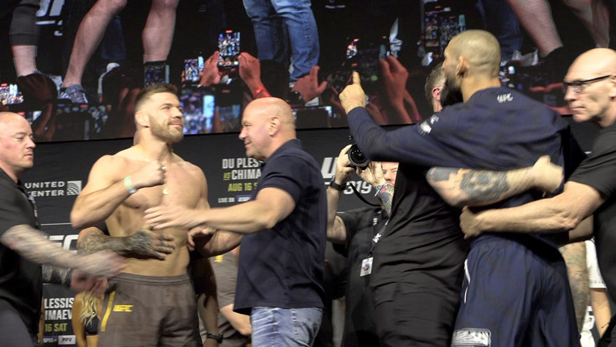 مع ترقب لقب لقب الوزن المتوسط يوم السبت في مركز United Center (ESPN+ PAY-PER-VIEW ، ESPN ، ESPN+) طوال أسبوع القتال ، حصل بطل DU PLESSIS (23-2 MMA ، 9-0 UFC) ، و Chimaev (14-0 MMA ، 8-0 UFC) نظرة أخيرة على بعضها البعض خلال فترة نهائية واحدة.