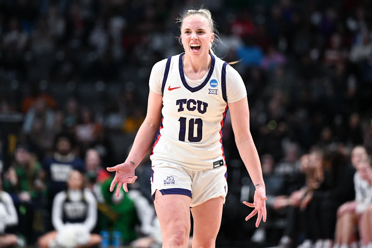 كان لدى هيلي فان ليث الكثير من الأسباب للاحتفال بعد قيادة TCU إلى أول Elite Eight على الإطلاق. (Greg Fiume/Getty Images)