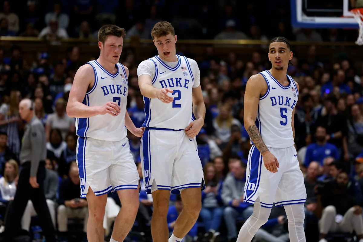 سيلعب Duke's Kon Knueppel و Cooper Flagg و Tyrese Proctor في النهائي الرابع يوم السبت. (Lance King/Getty Images)