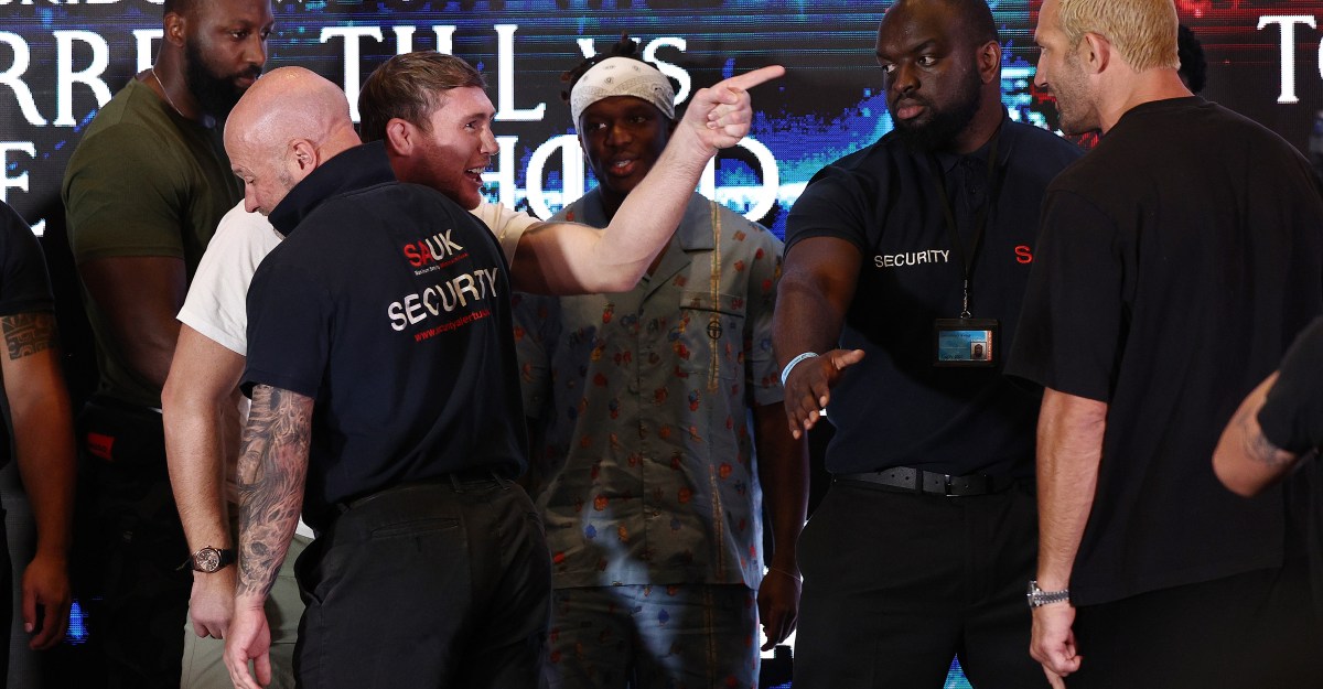 لندن ، إنجلترا – 23 يوليو: يطرح توني فيرغسون وملح بابي لالتقاط صورة مع KSI ، الرئيس التنفيذي والمؤسس المشارك لـ Misfits Boxing ، بعد مواجهته قبل معركة لقب MFB المؤقت للوزن المتوسط ​​خلال مؤتمر Ring of Thrones في Glaziers Hall في 23 يوليو 2025 في لندن ، إنجلترا. (تصوير جيمس فيرن/غيتي إيمايز)